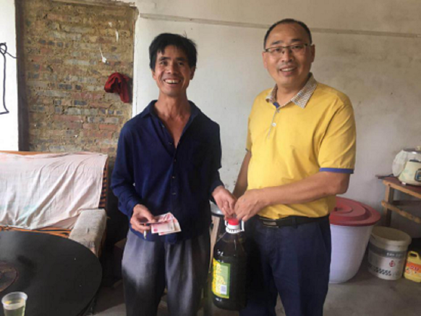 圖為公司董事長楊景龍為陳玉坤送去食用油和慰問金。