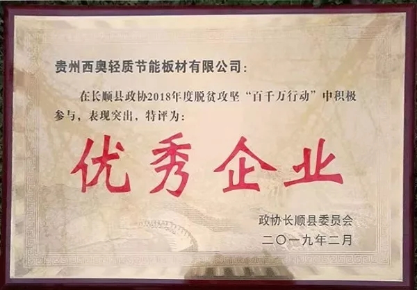 2月24日,政協(xié)長順縣第九屆委員會(huì)第三次會(huì)議上,貴州西奧輕質(zhì)節(jié)能板材有限公司等11家委員企業(yè)被表彰為長順縣政協(xié)2018年度脫貧攻堅(jiān)“百千萬行動(dòng)”優(yōu)秀企業(yè)。